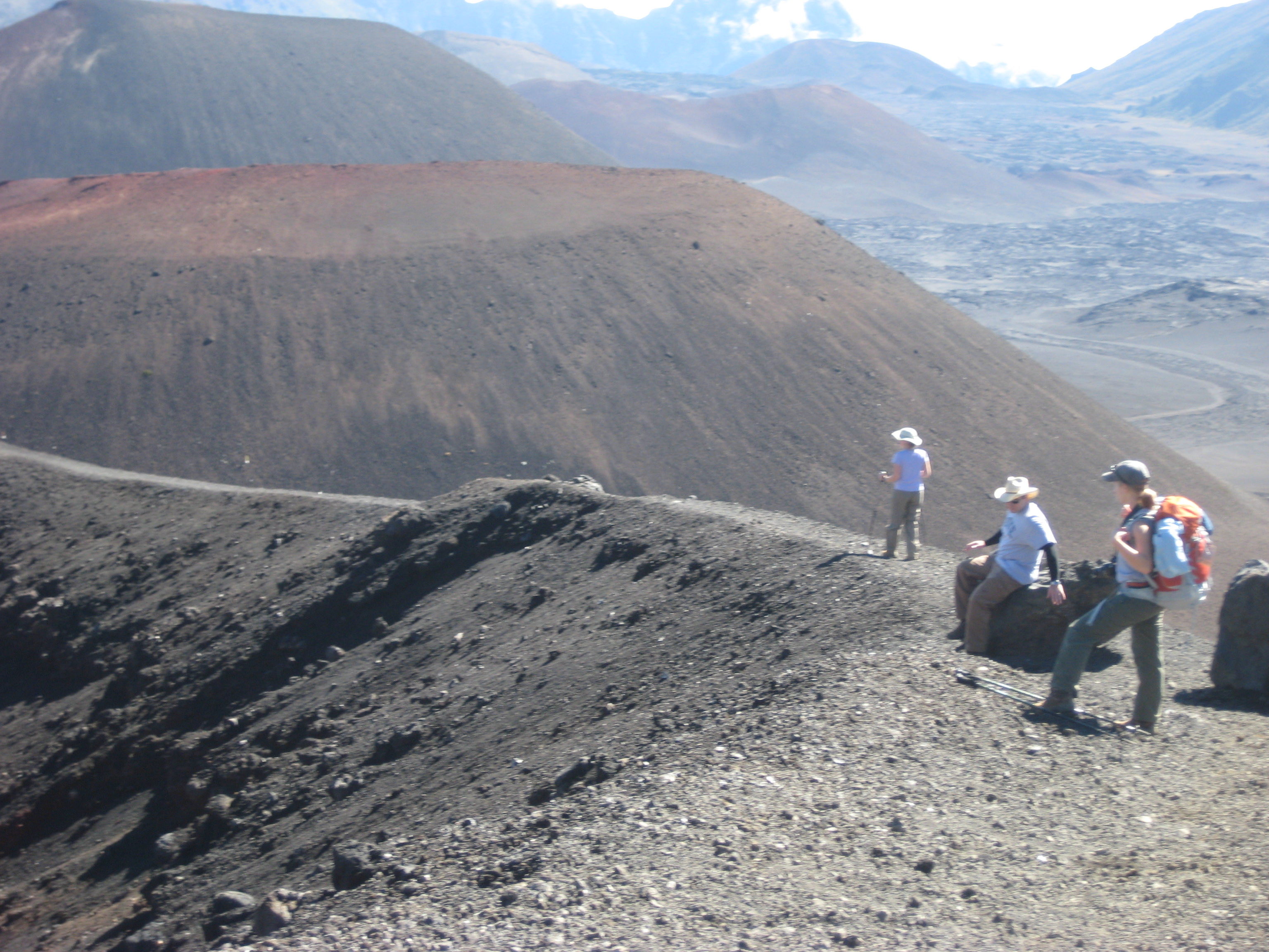 We started the hike at the summit, which, at 9,700 feet, has absolutely no vegetation. With grey sand and intensely bright sun, it’s like looking out at Mars. For most of the morning we skidded down a path from the summit to the crater valley (along the aptly named Sliding Sands Trail), with me bringing up the rear. I had thought that this part would be colorless and boring, but it was stunning. There were great swaths of red sand that pierced through the steely grey and Technicolor pits with hues I’ve never seen on bare ground before.